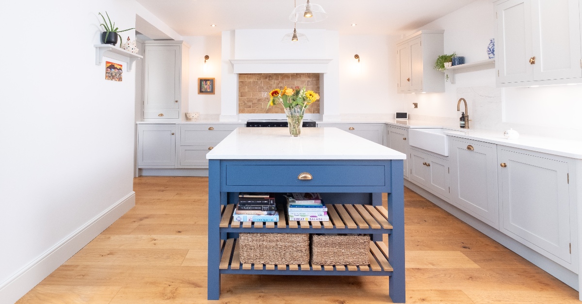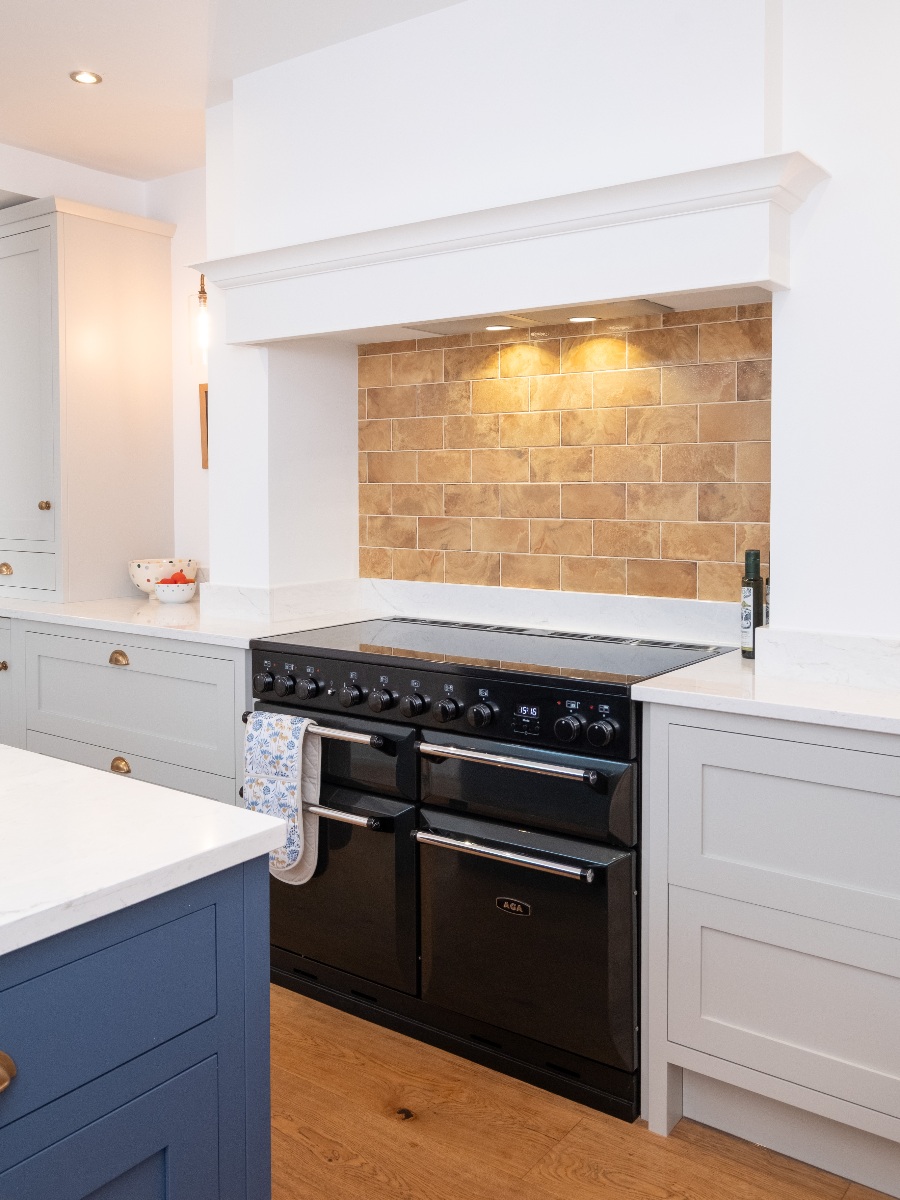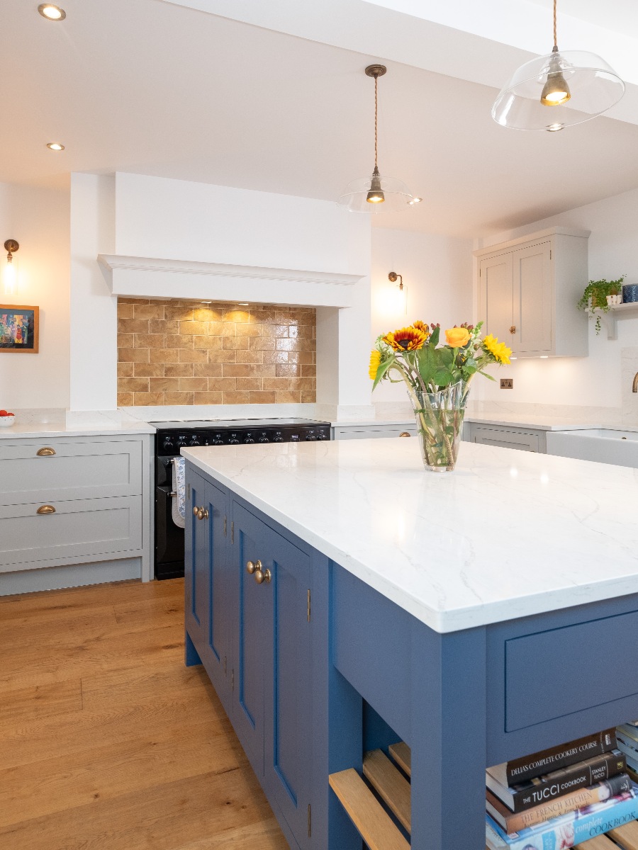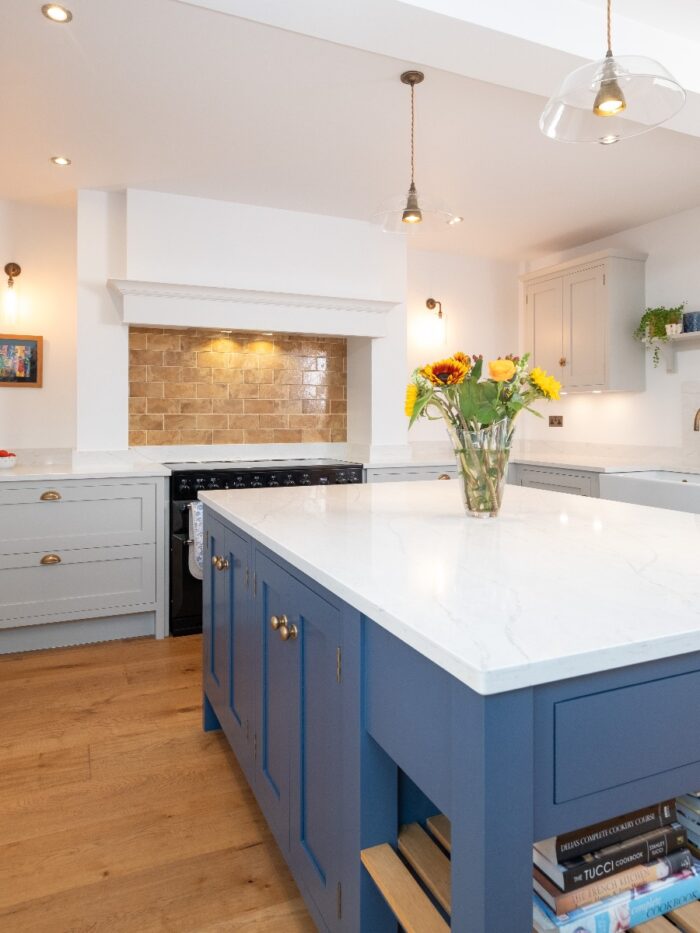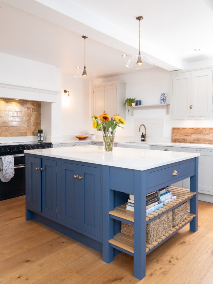 coordinated colour scheme in the new kitchen, using a soft neutral paint for most of the cabinetry, then a striking, deep blue on the island for contrast. The original oak floor adds warmth which is reflected in the golden tones of the tiled splashback in the chimney mantle, again picking up details from the painting.
