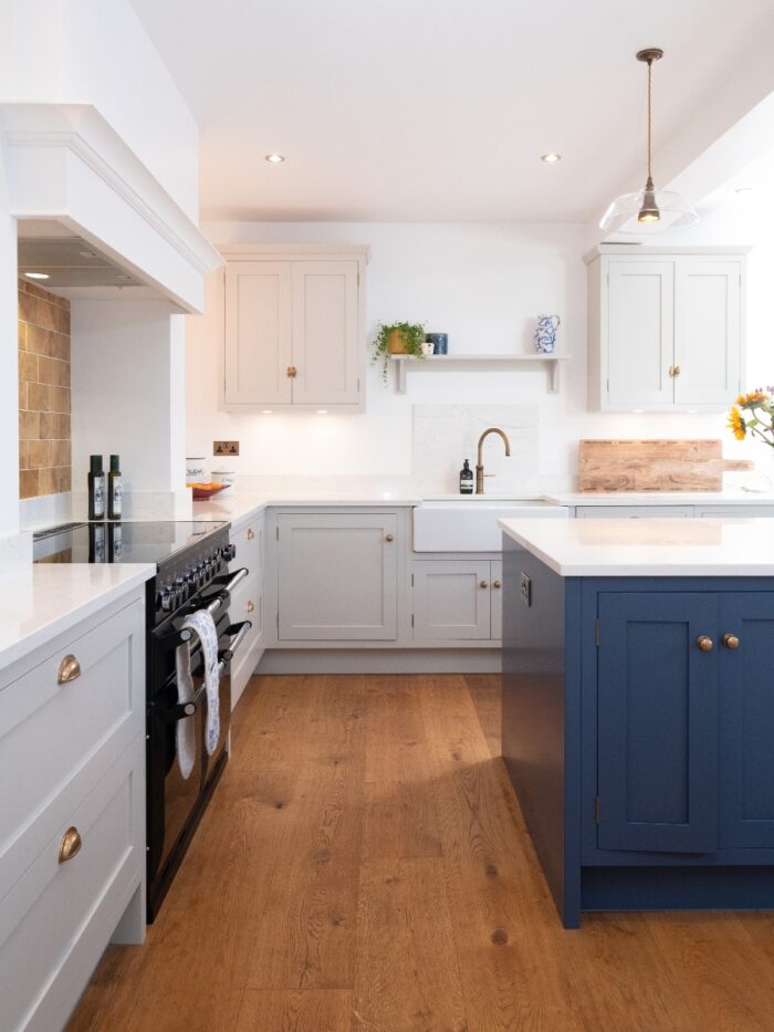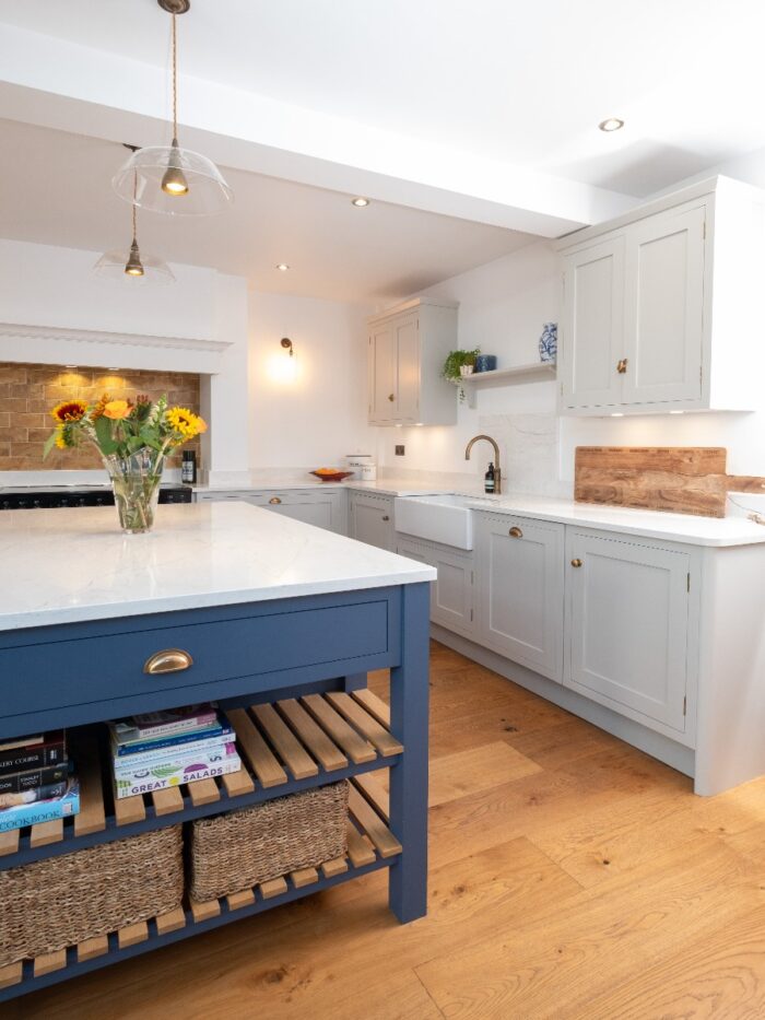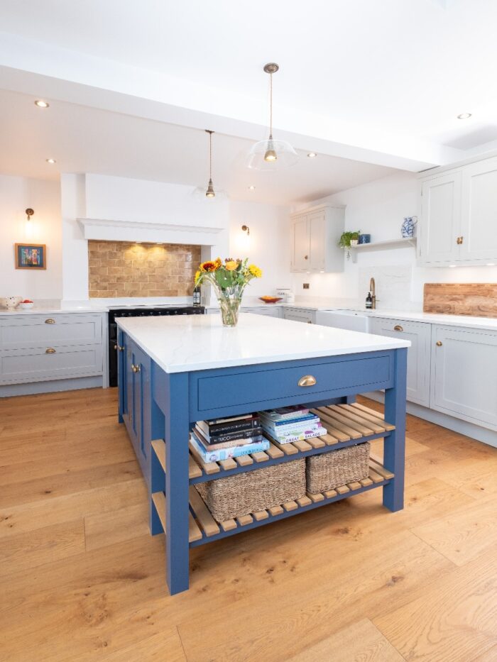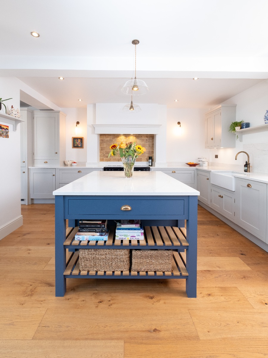 All the tall cabinets were positioned to the left of the dividing wall, almost out of sight, to ensure the main kitchen area felt open and airy. As there are no windows in this area, we opted to make a feature of the Belfast sink on the side wall, centred to two matching wall cabinets with decorative shelf between. This keeps the island surface clear for prep and serving, a useful area which is conveniently positioned for both the sink and cooker. An open oak shelving unit on the dining room side of the end of the island creates added interest and is a useful space for displaying some of the client’s many treasured pieces.