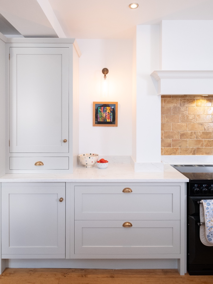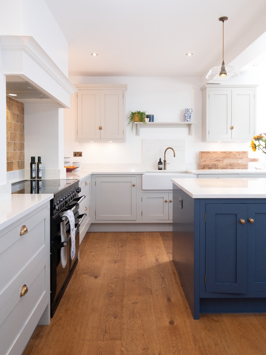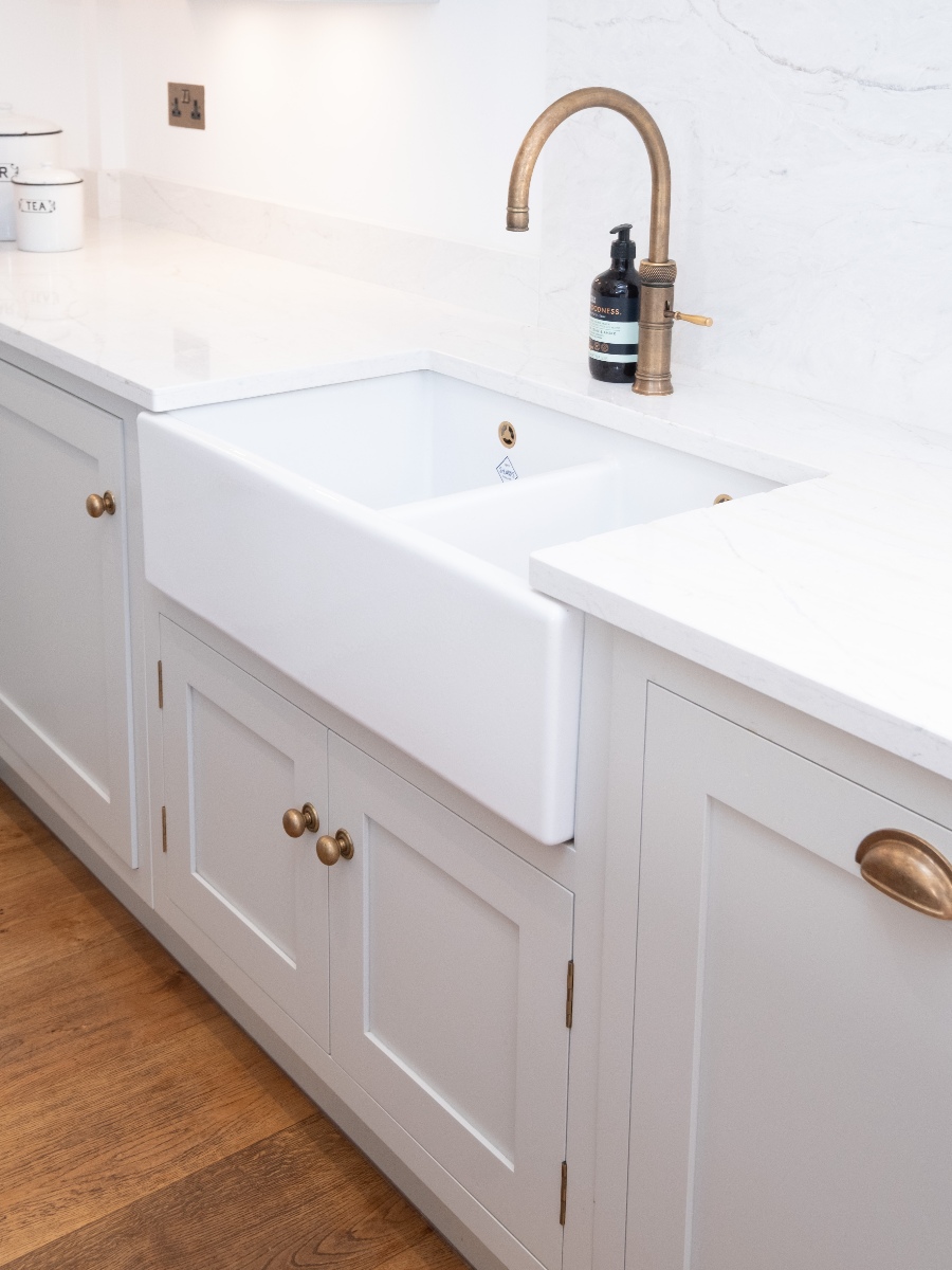 All the tall cabinets were positioned to the left of the dividing wall, almost out of sight, to ensure the main kitchen area felt open and airy. As there are no windows in this area, we opted to make a feature of the Belfast sink on the side wall, centred to two matching wall cabinets with decorative shelf between. This keeps the island surface clear for prep and serving, a useful area which is conveniently positioned for both the sink and cooker. An open oak shelving unit on the dining room side of the end of the island creates added interest and is a useful space for displaying some of the client’s many treasured pieces.