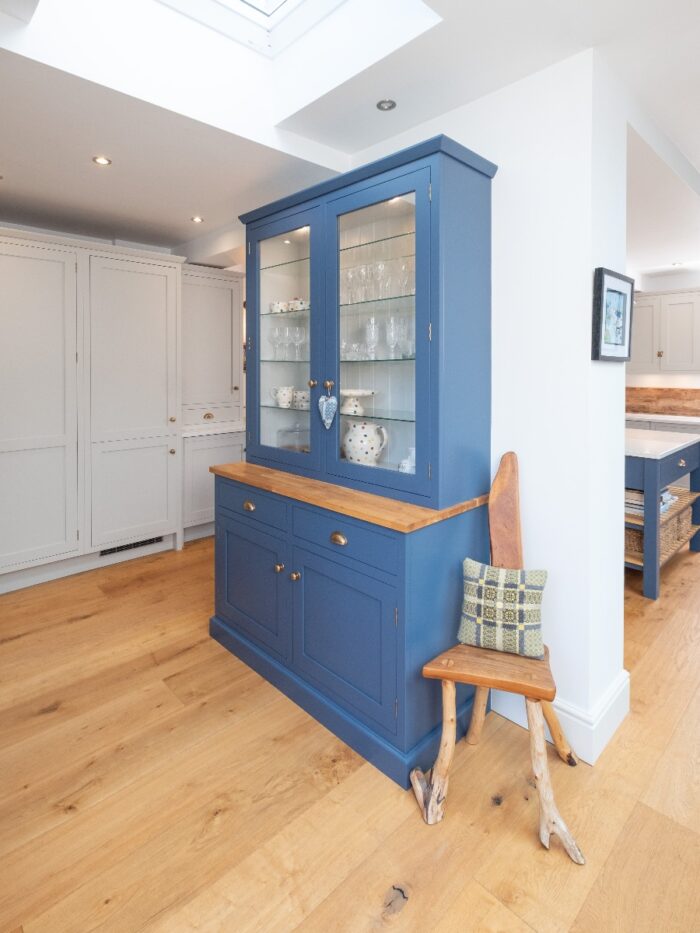 On the back of the dividing wall, a glazed dresser unit, painted in the same blue as the island, makes use of the extra wall space and is perfect for storing china and glassware next to the dining table, with a lovely little handmade antique chair alongside to create a pretty vignette.
