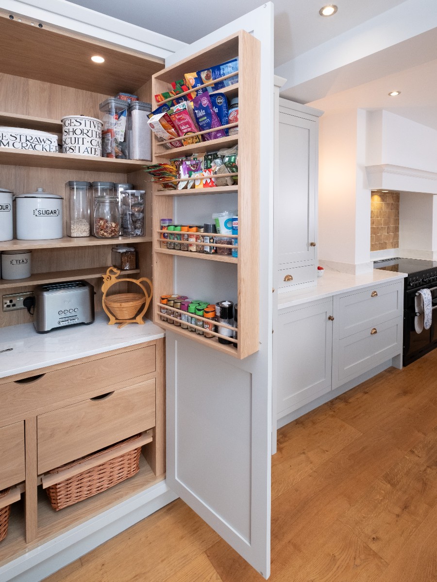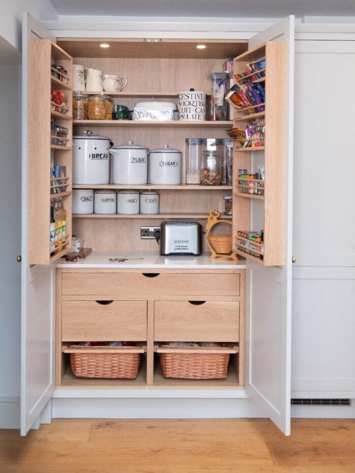- Oak larder with internal drawers and baskets